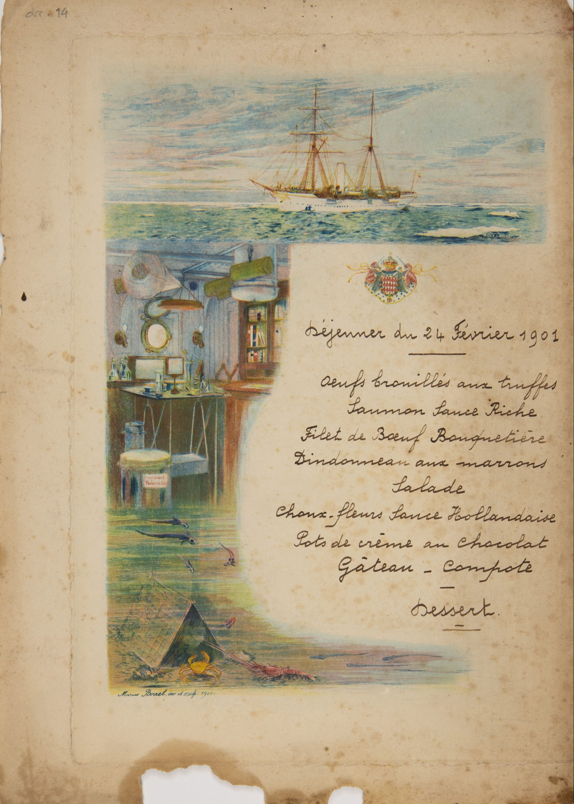 Desenho colorido da Ementa do iate Princess Alice. Não está assinado. Escrito em francês e datado de 24 de fevereiro de 1901.