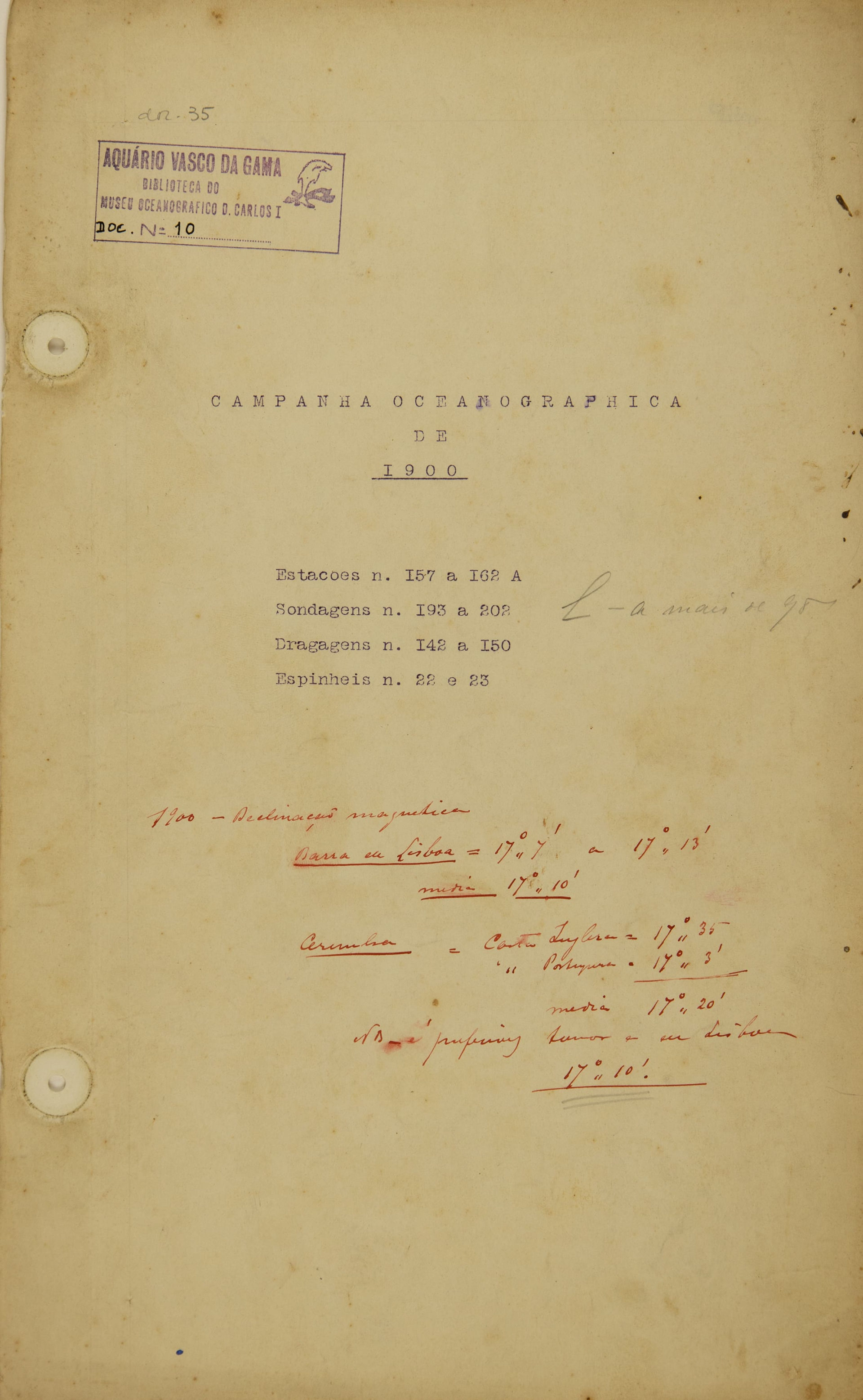 Manuscritos e /ou escritos à máquina, com os resultados dos trabalhos efetuados. Bloco de folhas presas por atache (inclui a indicação das estações, sondagens, dragagens, espinheis). Inicia-se a 21 de maio e termina a 31 de agosto.